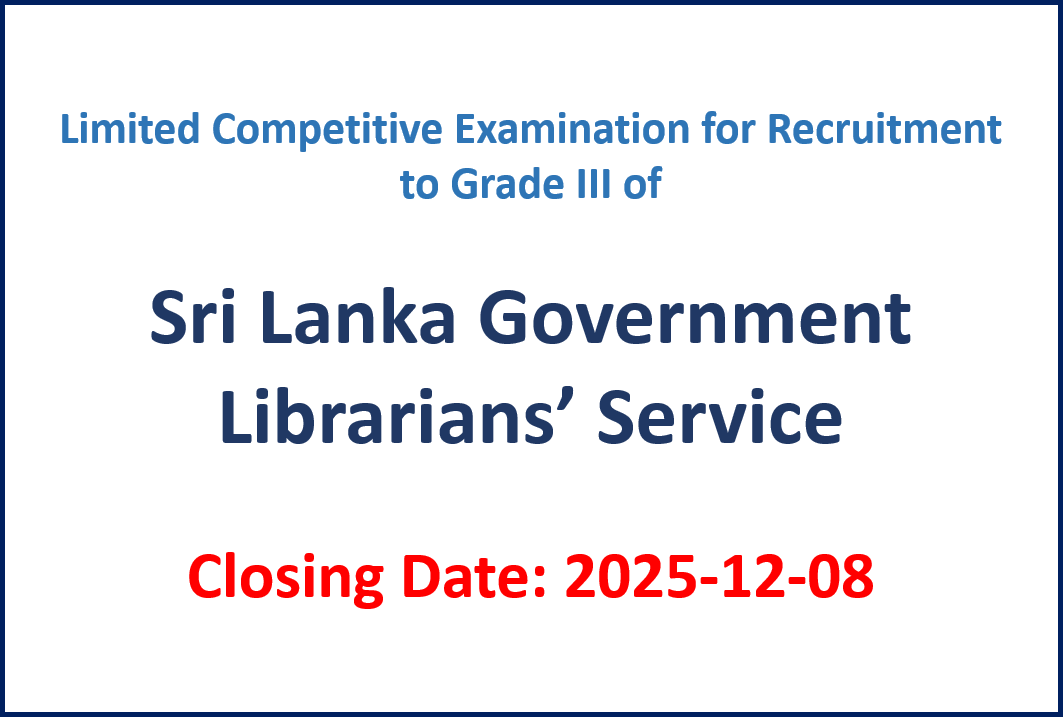 Limited Competitive Examination for Recruitment to Grade III of Sri Lanka Government Librarians’ Service Closing Date: 2025-12–08 Details – Sinhala Details – English Source : Government Gazette 2025-11-07