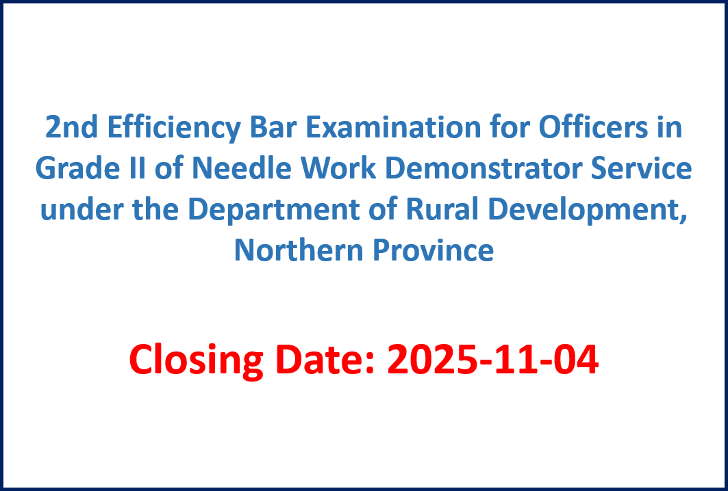 EB Circular for 2nd Efficiency Bar Examination for Officers in Grade II of Needle Work Demonstrator Service under the Department of Rural Development, Northern Province – 2018(I) 2025 Circular – Tamil Application – Tamil Source Northern Provincial Council (www.np.gov.lk)