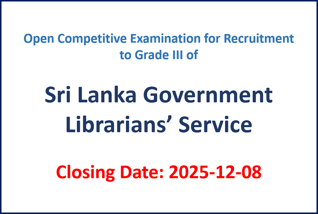 Open Competitive Examination for Recruitment to Grade III of Sri Lanka Government Librarians’ Service Closing Date: 2025-12–083 Details – Sinhala Details – English Source: Government Gazette 2025-11-07