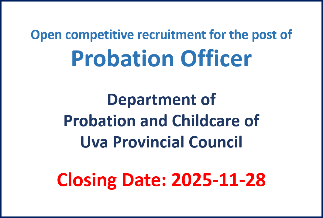 Open competitive recruitment for the post of Probation Officer – Department of Probation and Childcare of Uva Provincial Council Open competitive recruitment for the post of Probation Officer Class II of the Department of Probation and Childcare of Uva…